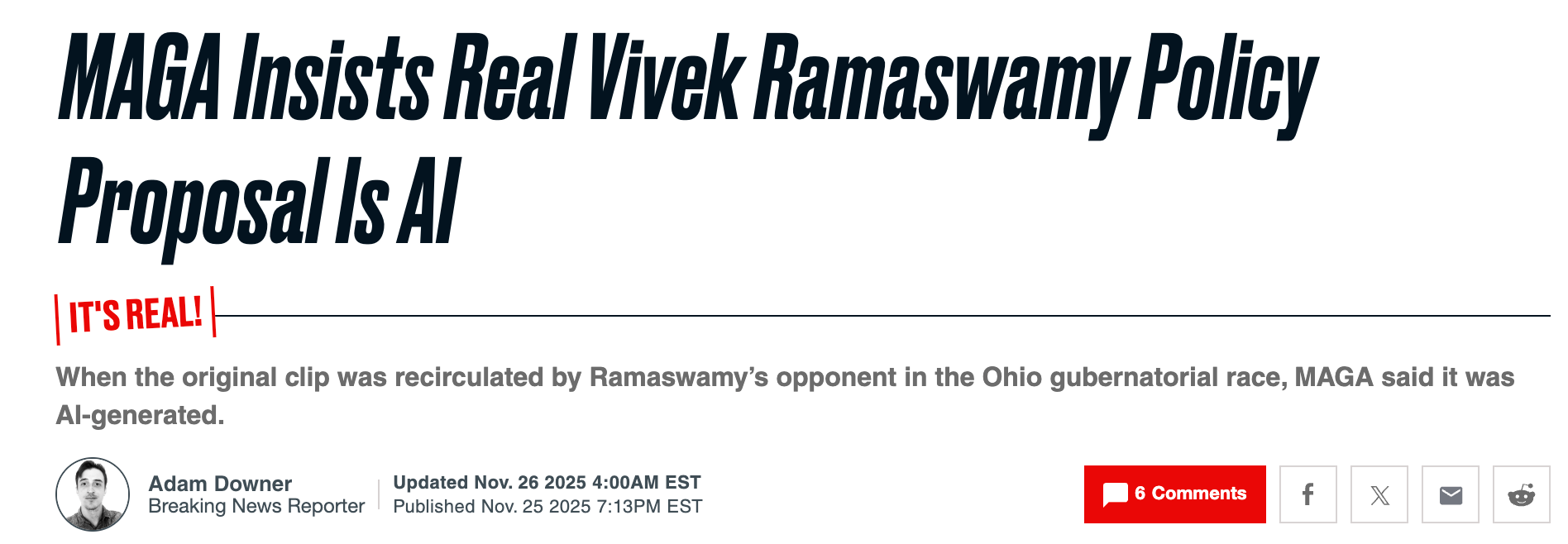 Next thing you know, Amy was being mass-accused by folks on the right & supporters of Ramaswamy’s of posting an “AI deep fake” of Vivek…even though the video was 100% real. His campaign even said so it to the press.